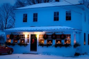 This is a photo of the Beard & Boyd Insurance building in Amherst, NH, all decked out in Christmas decoration and holiday lights. In the larger version, you can see the lights sparkle, showing little star shapes. Looks very welcoming, I feel.
